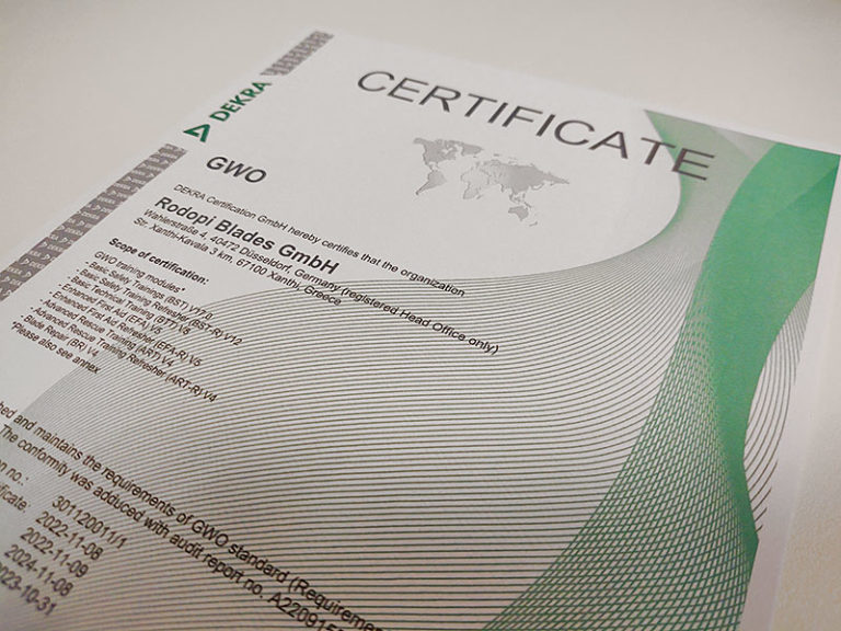 Die RODOPI Blades GmbH ist stolz darauf, die erfolgreiche Re-Zertifizierung der RODOPI Academy durch die Global Wind Organisation (GWO) verkünden zu dürfen. Dies bestätigt erneut unseren hohen Standard in der Ausbildung und unser kontinuierliches Engagement für Qualität und Sicherheit in der Windenergiebranche.