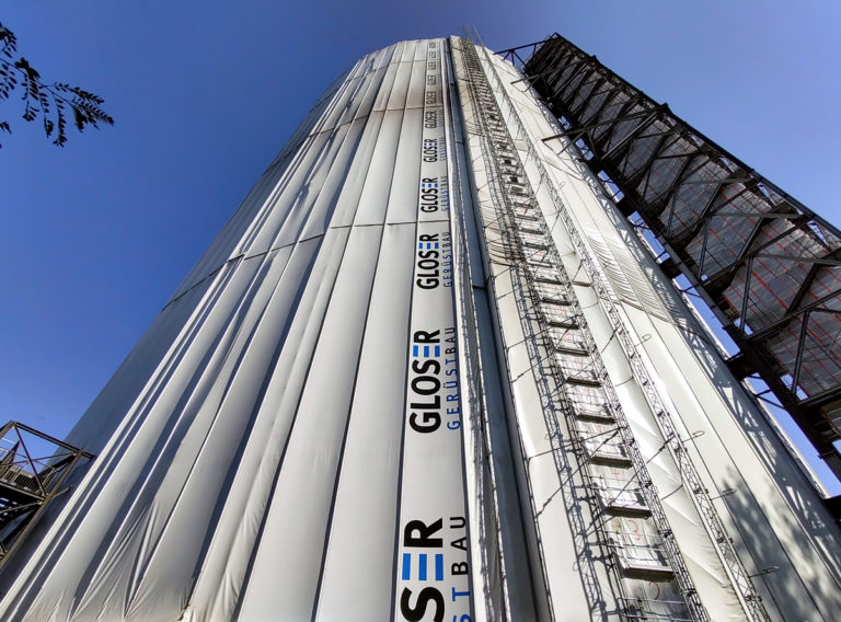Zur Vorbereitung der Korrosionsschutzarbeiten wurde der Gasometer im Februar 2020 eingerüstet, im März folgte anschließend die Einhausung des Fassadengerüsts mit einer hellen Plane. Diese sorgt dafür, dass beim Abstrahlen der Außenhülle Farb- und Metallreste auf der Baustelle verbleiben. Bei den späteren Arbeiten am Korrosionsschutz verhindert die Plane außerdem, dass die behandelten Flächen der Witterung ausgesetzt waren. Zudem ermöglicht sie bei der Trocknung der Farbschichten konstante Bedingungen in Bezug auf Luftfeuchtigkeit und Temperatur. Aus diesem Grund schließt die Plane luftdicht ab.